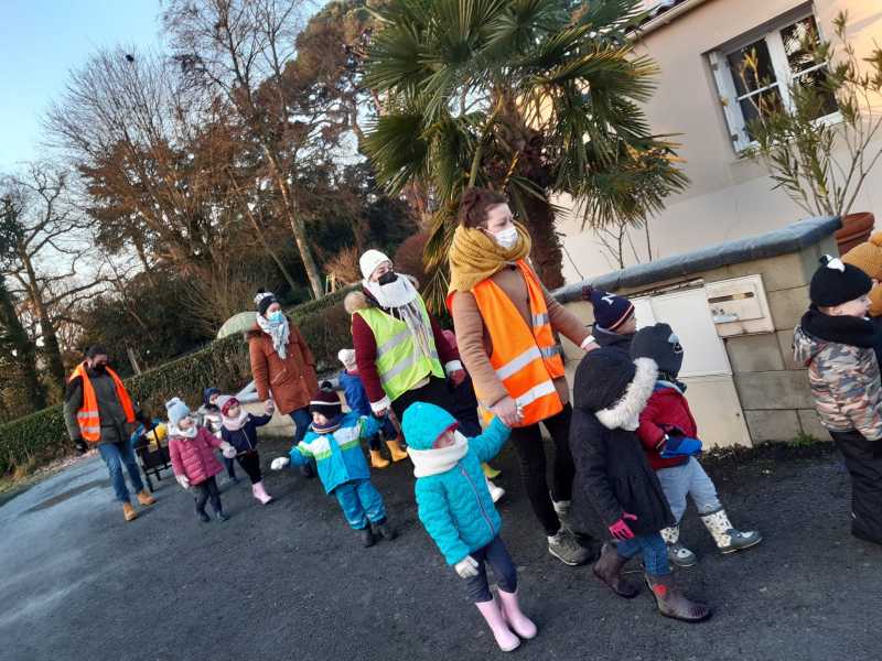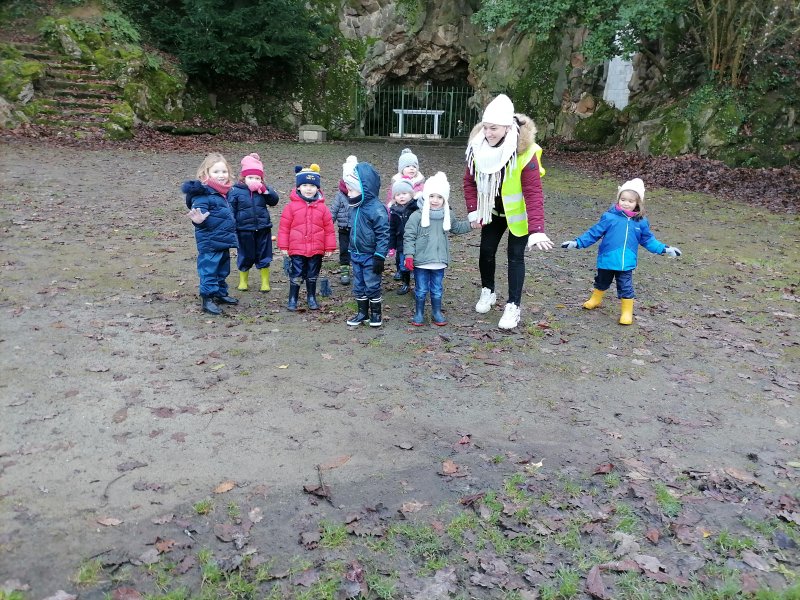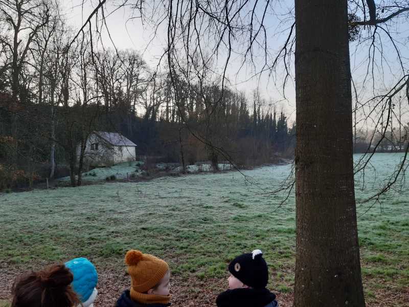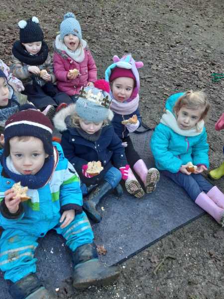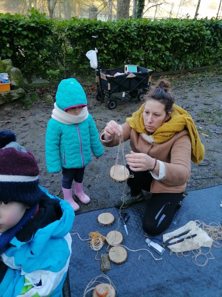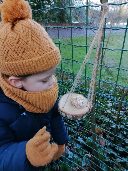 Cette matinée “école dehors” commence bien emmitouflés de la tête au pieds ! A la grotte de Lourdes, nous accrochons sur les petites branches, nos mangeoires (sur du bois, dans les oranges), les oiseaux vont se régaler ! et la semaine prochaine, nous observerons… Et nous !!!! Nous savourons la galette !!!! Merci beaucoup au papa et aux mamans de votre présence indispensable.