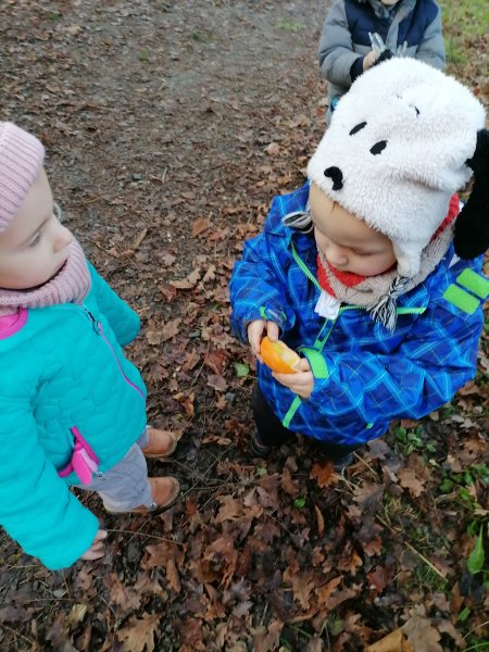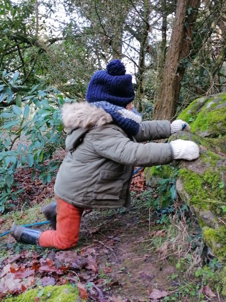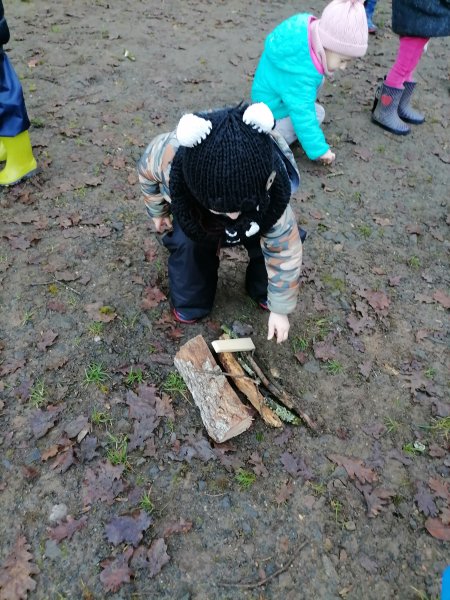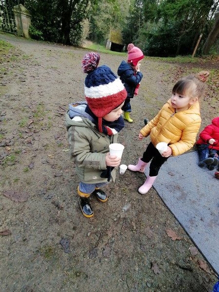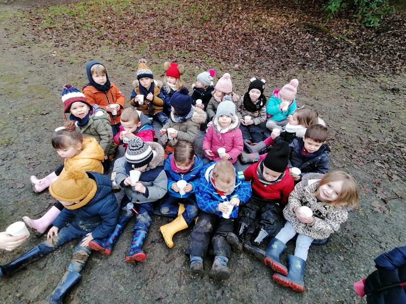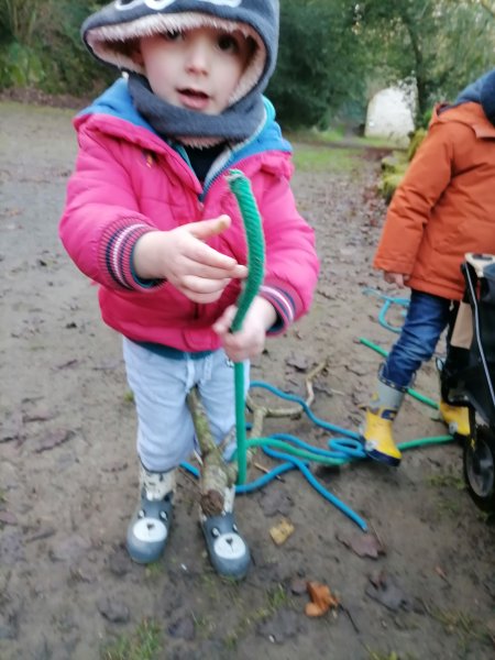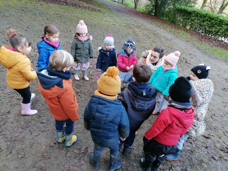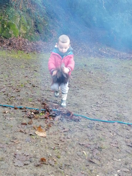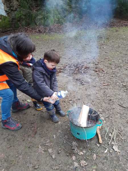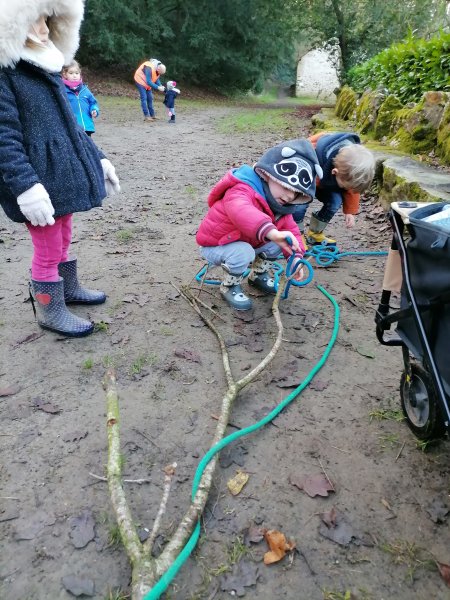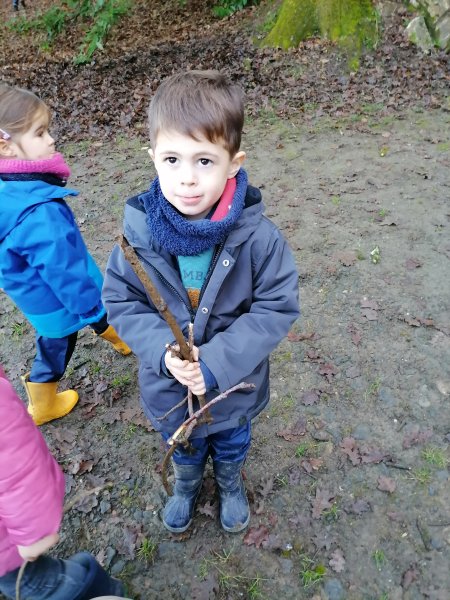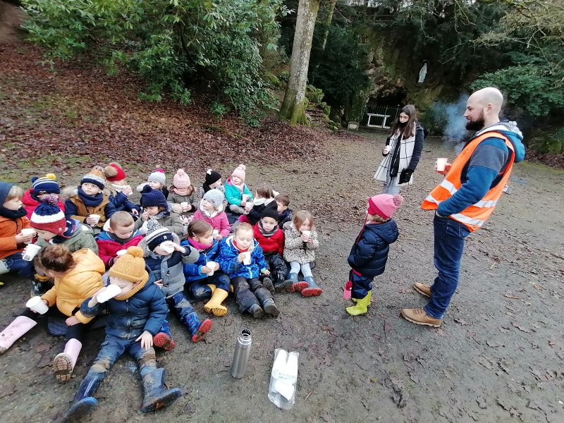 Ce matin, notre chariot est bien rempli !! des surprises nous attendent à la grotte ? Nous faisons un petit feu.. pour “faire chauffer des choses ?  non ! pour manger non ! pour se réchauffer ?” Oui !!! Quelques enfants ont passé leur matinée à chercher des petits bois secs pour alimenter le feu, d’autres sont allés vérifier si les oiseaux avaient bien mangé. Tous ont beaucoup sauté, grimpé, découvert, exploité ; puis, nous nous sommes posés autour d’un petit chocolat chaud.. ! Merci beaucoup au papa et maman, votre présence =experiences.