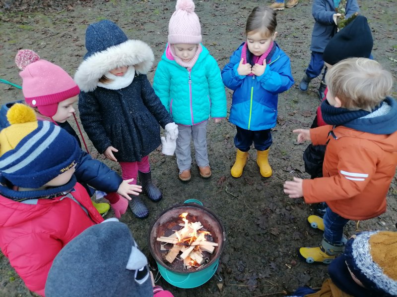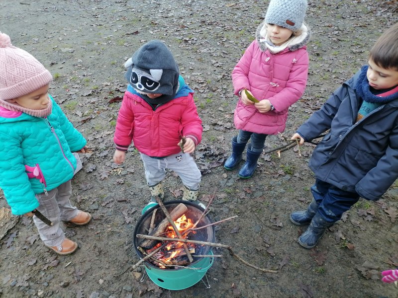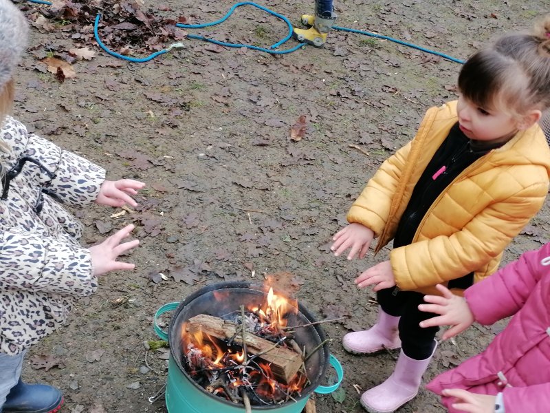 Ce matin, notre chariot est bien rempli !! des surprises nous attendent à la grotte ? Nous faisons un petit feu.. pour “faire chauffer des choses ? non ! pour manger non ! pour se réchauffer ?” Oui !!! Quelques enfants ont passé leur matinée à chercher des petits bois secs pour alimenter le feu, d’autres sont allés vérifier si les oiseaux avaient bien mangé. Tous ont beaucoup sauté, grimpé, découvert, exploité ; puis, nous nous sommes posés autour d’un petit chocolat chaud.. ! Merci beaucoup au papa et maman, votre présence =experiences.